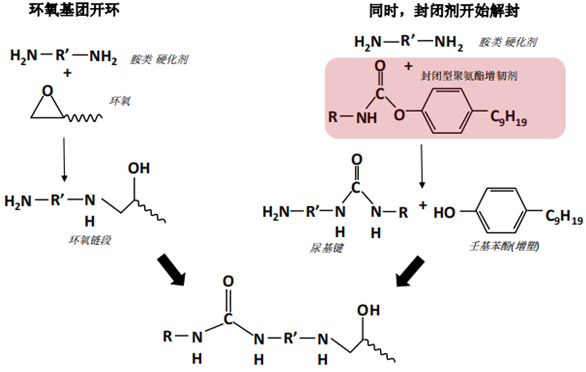 環(huán)氧樹脂具有很高的結構強度,但有時候同時需要高強度和高韌性,這可以通過降低交聯(lián)密度和增加彈性鏈段來實現(xiàn)。封閉型異氰酸酯增韌劑可以在增加彈性鏈段的同時降低交聯(lián)密度。增韌機理如下圖所示