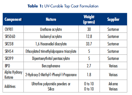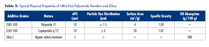 基礎(chǔ)的聚氨酯丙烯酸酯配方(表1)由丙烯酸單體的混合物組成,如丙烯酸異冰片酯、1,6己二醇二丙烯酸酯、二季戊四醇五丙烯酸酯和乙氧基化三羥甲基丙烷三丙烯酸酯與聚氨酯丙烯酸低聚物。此配方推薦用于剛性和柔性塑料基材上的面漆。在加入超細(xì)聚酰胺粉末之前,該體系的關(guān)鍵特性是與塑料基材的良好附著力以及硬度和柔韌性的良好結(jié)合。超細(xì)聚酰胺粉末是由十二內(nèi)酰胺和/或己內(nèi)酰胺直接聚合而成的聚合物和共聚物。這種獨(dú)特的工藝生產(chǎn)出具有特定尺寸、比表面積和熔點(diǎn)的微孔球形珠。平均粒徑(APS)為5至60微米。這些超細(xì)聚酰胺粉體的結(jié)構(gòu)、形狀、較窄的粒徑分布和性能使其與涂料工業(yè)中使用的其他粉體或添加劑有顯著的不同。對(duì)于本研究中使用的每個(gè)等級(jí)粒徑分布非常窄,平均粒徑為10微米(表2提供了這些聚酰胺等級(jí)和二氧化硅A的典型物理性能)。在本研究中,采用超細(xì)聚酰胺粉末和二氧化硅的濃度梯度,按總配方的重量從1份到10份。