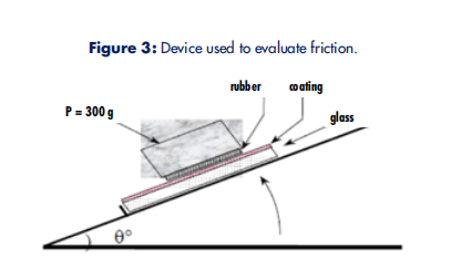 圖3所示的一個(gè)非常簡(jiǎn)單的裝置用于評(píng)估涂層表面的滑動(dòng)性。將300g橡膠鞋底(6x6 cm)置于紫外線固化膜上。然后逐漸傾斜樣品,直到開始向下移動(dòng),并測(cè)量角度θ。角度越大,表面就越不光滑。配方F0的角度約為30°。超細(xì)聚酰胺12或共聚酰胺6/12粉末的加入使角度降低到25°。二氧化硅濃度為10%時(shí),角度下降到18°。二氧化硅材料的性能與超細(xì)聚酰胺粉末不同。