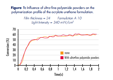 采用FT (RTIR)光譜法研究了超細(xì)聚酰胺粉末對(duì)紫外光固化配方的影響。如圖1所示,轉(zhuǎn)化率隨時(shí)間的變化曲線,超細(xì)聚酰胺粉末(超細(xì)聚酰胺12粉末重量的10%)對(duì)光聚合動(dòng)力學(xué)沒有影響。對(duì)超細(xì)共聚酰胺粉末3501 EXD(10%重量)也得到了相同的結(jié)果。