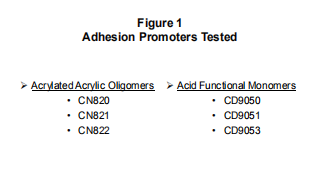 具有促進(jìn)粘附特性的齊聚物將單獨(dú)測試或與酸性單體功能性粘附促進(jìn)劑聯(lián)合測試,以確定用于給定基材的最佳齊聚物類型。 還將確定粘合促進(jìn)劑的正確添加水平,以獲得最佳性能結(jié)果。此外,還將探討與低聚物類型有關(guān)的防潮性能。
