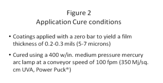 這里選擇的條件代表了金屬裝飾行業(yè)中常用的條件。 理想的薄膜厚度應(yīng)保持在最低的成本,但同時(shí)厚度足以使性能不受影響。 這是在下面列出的標(biāo)稱薄膜厚度下實(shí)現(xiàn)的。此外,所引用的固化條件對于這些應(yīng)用來說是相當(dāng)常見的,因?yàn)楸⊥该鲗拥膽?yīng)用不需要特殊的光源。還報(bào)告了輻射計(jì)的類型和獲得的結(jié)果,以避免會影響薄膜性能的條件的任何變化,從而確保最終用途測試結(jié)果的一致性。 圖2描述了應(yīng)用固化條件。