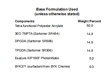 如上展示的明顯優(yōu)勢,選擇PEA作為該配方的主要成分。本研究選用的單體包括三丙二醇二丙烯酸酯(TPGDA)、二丙二醇二丙烯酸酯(DPGDA)和3-乙氧基三羥甲基丙烷三丙烯酸酯(3EO-TMPTA)。TPGDA是一種低揮發(fā)性、低粘度的單體,在自由基聚合中由于成本的原因而被廣泛使用。DPGDA也是一種經(jīng)濟(jì)的可取代己二醇二丙烯酸酯(HDDA)的反應(yīng)單體。它具有良好的降粘性能,更便于用戶使用,主要刺激指數(shù)(PII)為2,而HDDA為5。乙氧基化TMPTA也因其低皮膚刺激性而被選中,但它提供了更高交聯(lián)度和增強(qiáng)表面固化的附加好處。用于這些配方的光引發(fā)劑是與2-羥基-2-甲基-1-苯基-1丙酮混合的聚合α-羥基苯基酮。使用表面活性劑以確保基底適當(dāng)濕潤。基礎(chǔ)配方的粘度為300 cps@25℃。