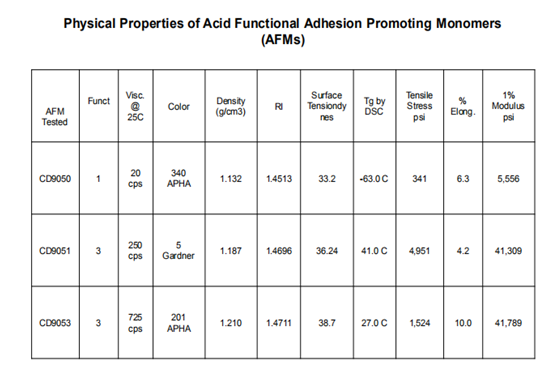 作為一個(gè)家族,這些產(chǎn)品可以用酸酯來形容。CD9050(現(xiàn)改為SR9050)是一種單官的增粘劑單體,能在金屬基體上提供優(yōu)異的附著力。CD9051(SR9051)和CD9053(SR9053)是CD9050的三官版本。它們提供相同的附著力。然而,由于它是三官的,它們提供更快的固化反應(yīng)和更大的硬度。由于這些產(chǎn)品的酸值較高,不推薦用于含有叔胺的脂肪酸中。建議使用量3%至7%。酸值范圍為120-195 mg KOH/g。下表說明了單體的物理性質(zhì)。