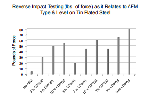 在TPS板上進(jìn)行了反向沖擊(RI)試驗(yàn),證明該基板最難粘附。顧名思義,反向沖擊試驗(yàn)意味著在涂層試板的反面降低一個(gè)重量。隨著重量下降的高度增加,沖擊力增加,試板和涂層的變形也增加。然后檢查沖擊區(qū)域是否有涂層開裂或附著力喪失的跡象。報(bào)告未檢測到涂層損壞的最大力。數(shù)據(jù)表明,隨著AFM濃度的增加,力也隨之增加。CD9053在最困難的基材上顯示出最大RI值,從而獲得最佳的整體性能。