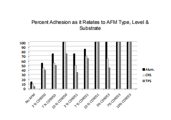 這一趨勢于每個(gè)AFM都是一致的。隨著AFM濃度的增加,粘附力提高。結(jié)果還表明,鋁相對容易粘附。與CRS的粘附更為困難,與TPS的粘附最為困難。當(dāng)檢測每個(gè)AFM的粘附性能時(shí),CD9053的結(jié)果最好。最佳添加量為7%~10%。下圖詳細(xì)說明了測試結(jié)果。