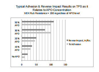 每種APOs都以10%到50%的濃度添加到基礎(chǔ)配方中。選擇鍍錫鋼(TPS)作為試驗(yàn)基體,因?yàn)樗亲铍y粘附的基材。涂層在先前概述的條件下施涂和固化。測試抗MEK、反向沖擊和交叉粘著性能。下圖顯示了與性能與APO濃度的相關(guān)性。每個(gè)APO的相關(guān)數(shù)據(jù)都是典型的。隨著APO濃度的提高,附著力和反向沖擊性能提高。良好附著力的最佳添加量為30%。隨著APO的增加,反向沖擊繼續(xù)上升。