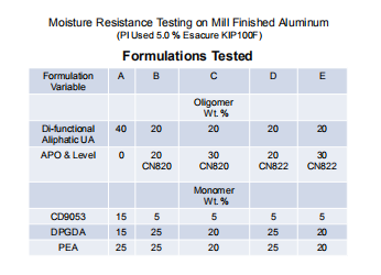 在這種情況下,APOs與聚氨酯丙烯酸酯齊聚物結(jié)合進(jìn)行測試。在20%和30%的添加水平下,使用的APO為CN820或CN822。“對照品”是配方A,不含APO。每層涂層均以12微米厚的薄膜施涂于磨光鋁上,并按照先前的說明進(jìn)行固化。