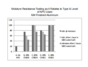 固化后,對試板在100℃的水中浸泡1小時(shí)和2小時(shí)后的初始粘附力進(jìn)行測試。當(dāng)CN820添加到30%的水平時(shí),固化后和在100℃水中浸泡1小時(shí)后的附著力良好。2小時(shí)后,粘附力下降到75%。CN822總體來看粘附性更好,在100℃水中浸泡2小時(shí)后,粘附性也很好。不含APO的“對照”制劑最初只有20%的粘附力,水中浸泡后沒有粘附力。下圖顯示相關(guān)結(jié)果。