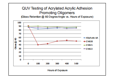 盡管沒有一種低聚物顯黃,但CN820在100小時(shí)的QUV暴露后確實(shí)顯示出明顯的光澤損失。目視檢查表明,這不是由于高官聚氨酯微裂紋引起的,而是由于水分暴露導(dǎo)致的表面侵蝕造成的光澤損失。