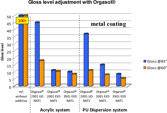 Orgasol®2001 EXD NAT1或 Orgasol®3501 EXD NAT1時(shí)光澤下降的對(duì)比